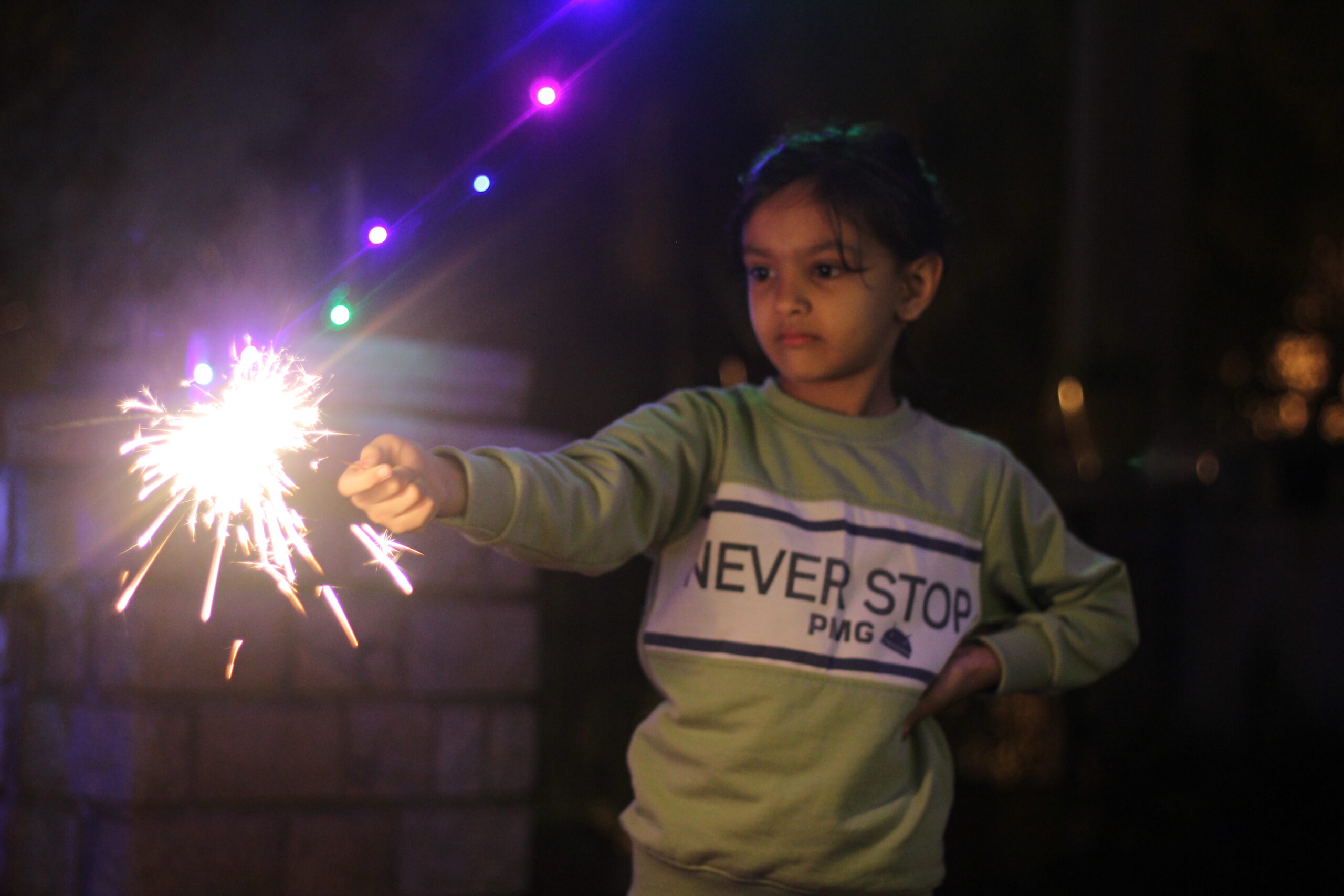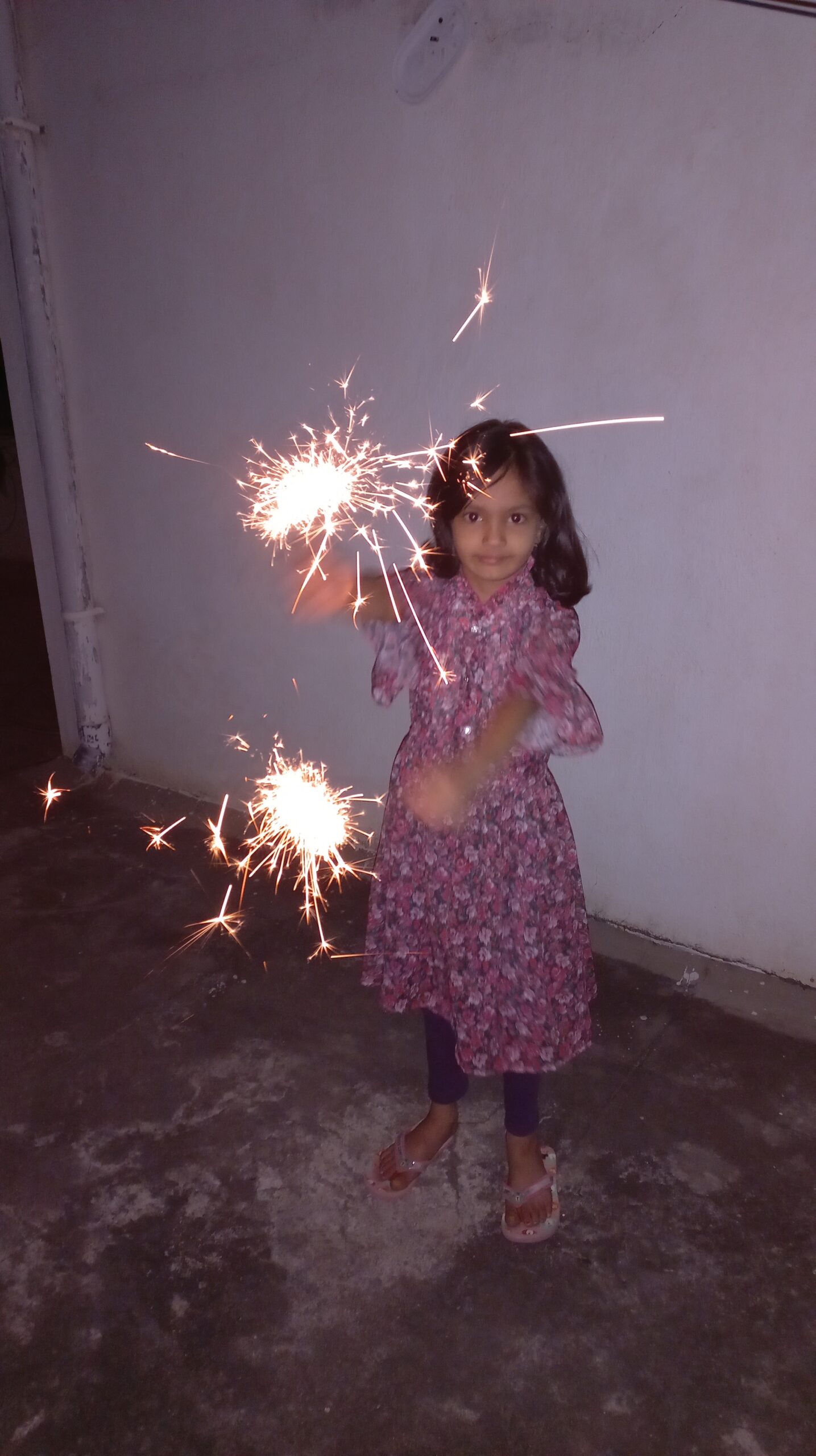 Shortly after Navaratri, we celebrated Diwali in Bangalore. And even though Vritima loves this festival of lights, she was constantly missing the fun and togetherness she experienced in Gujarat. But in her defense, even we were missing the festive vibes, dazzling fireworks, the family reunion and togetherness. However, that did not stop us from following our usual Diwali traditions. Vritima enjoyed performing puja and decorated the house with flowers, lights and earthen lamps. We had a small get-together with couple of our neighbors (they are like our extended family in Bangalore). And how can we celebrate Diwali without the firecrackers? Vritima was very excited to light-up the sparkles, flower pot and other firecrackers, all on her own.