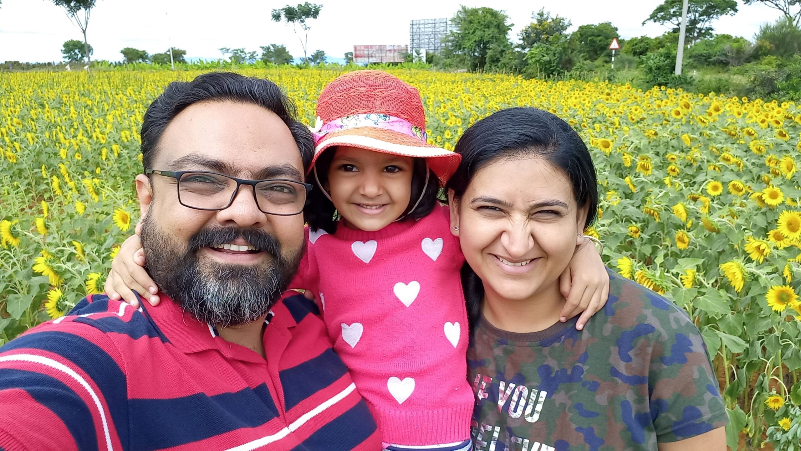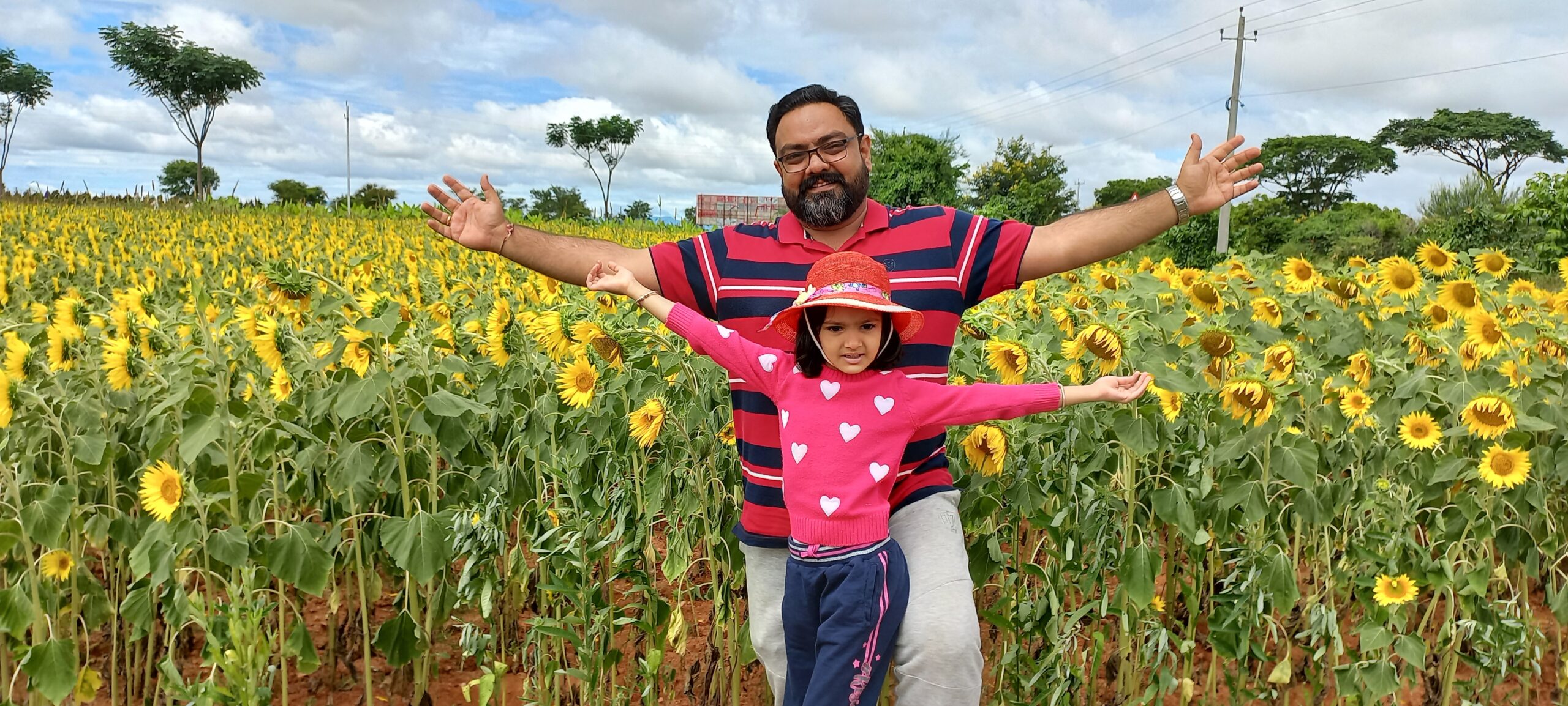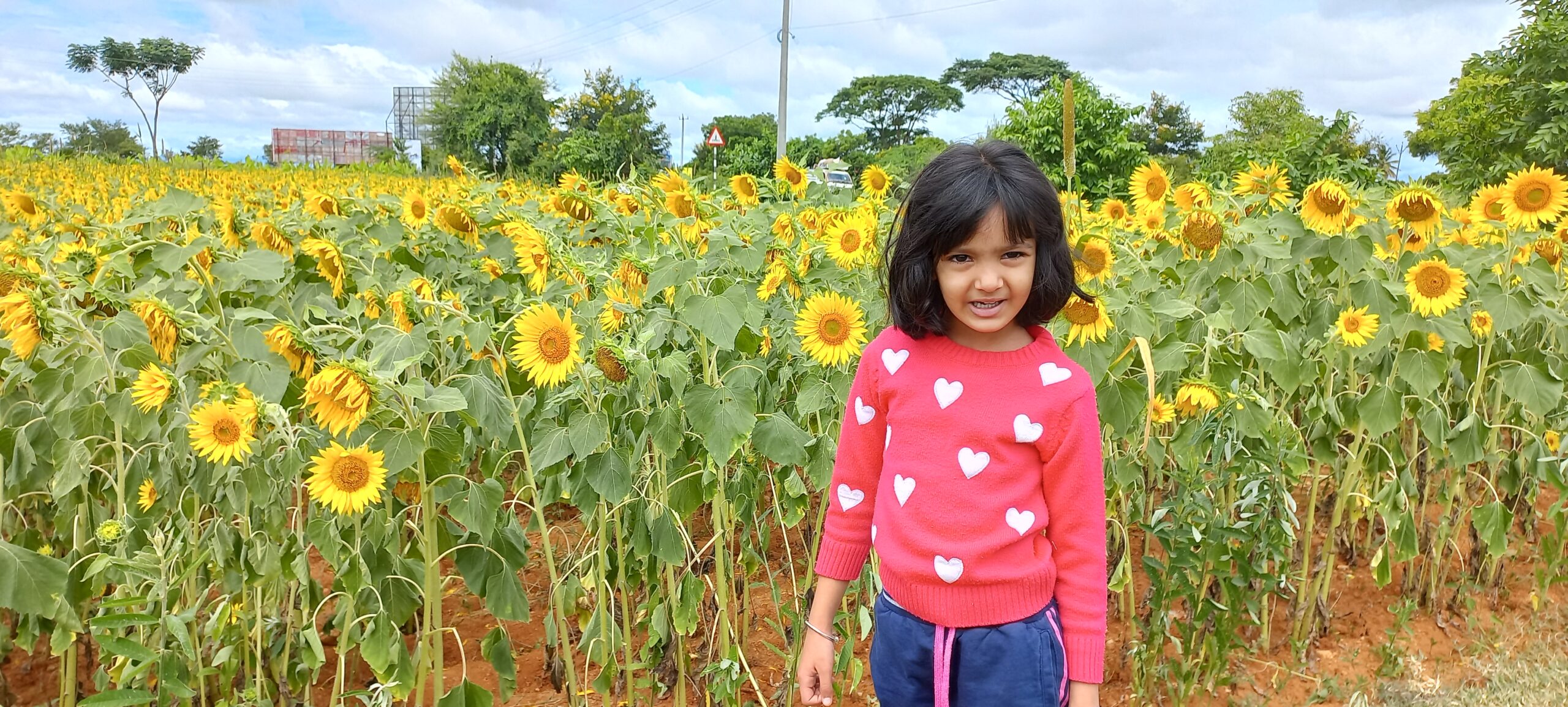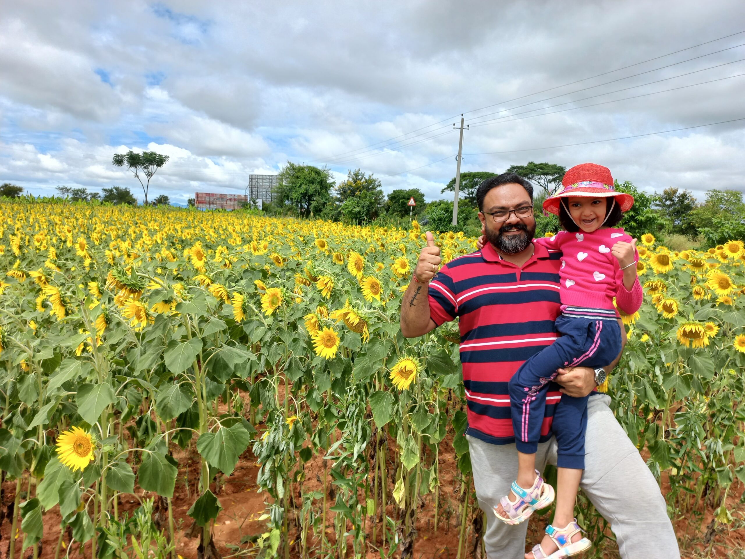 So we started on Friday early morning from Bangalore. The route is full of scenic landscapes that varies from beautiful Sunflower fields (Gundlupete – Bandipur stretch), thick forest of Bandipur National Park to vast rice fields, coconut and coffee plantations in Wayanad. We stopped by the sunflower fields, Vritima was mesmerized to see the big, bright yellow sunflowers and honeybees hovering over them, We took an opportunity to teach her how the sunflowers always face the sun, and she walked across the whole farm to confirm all of the flowers were facing sun.