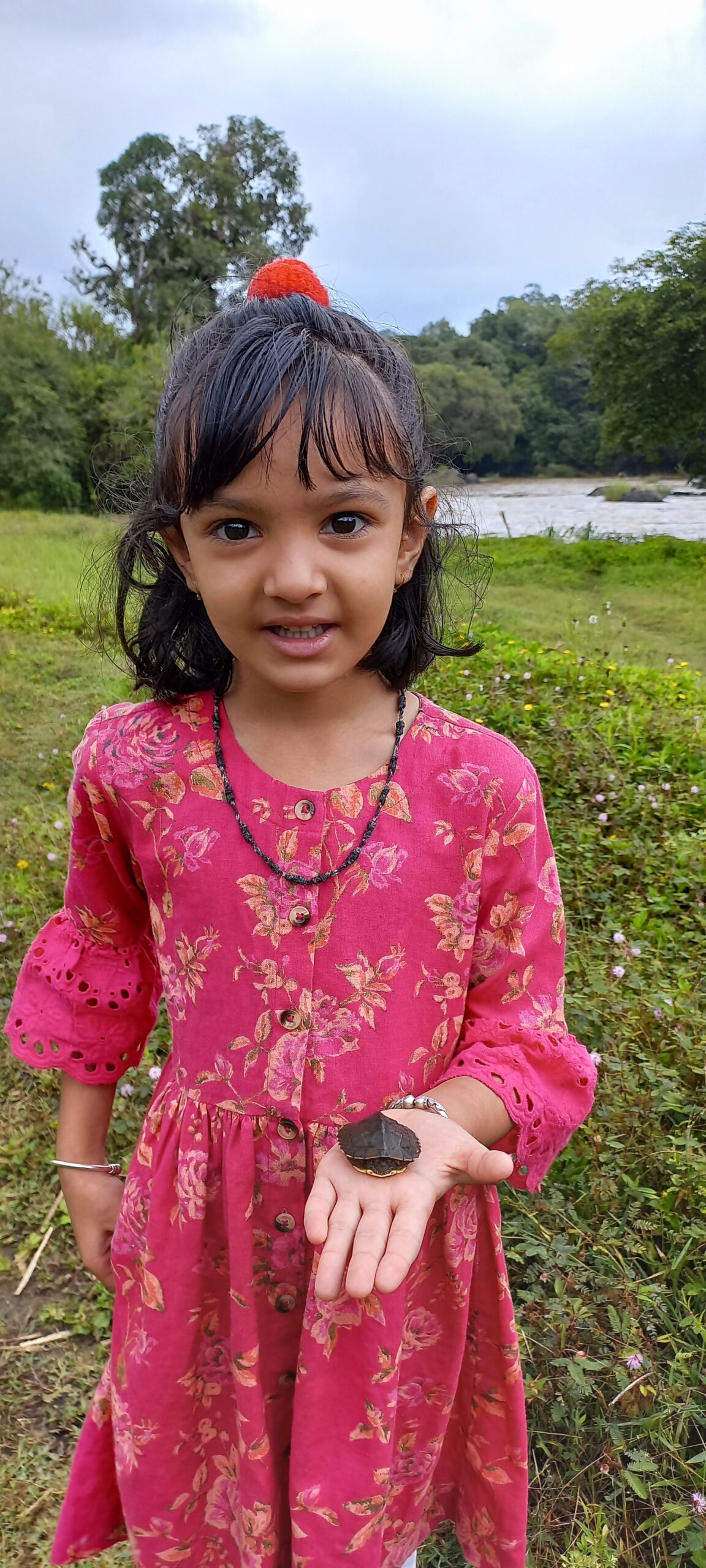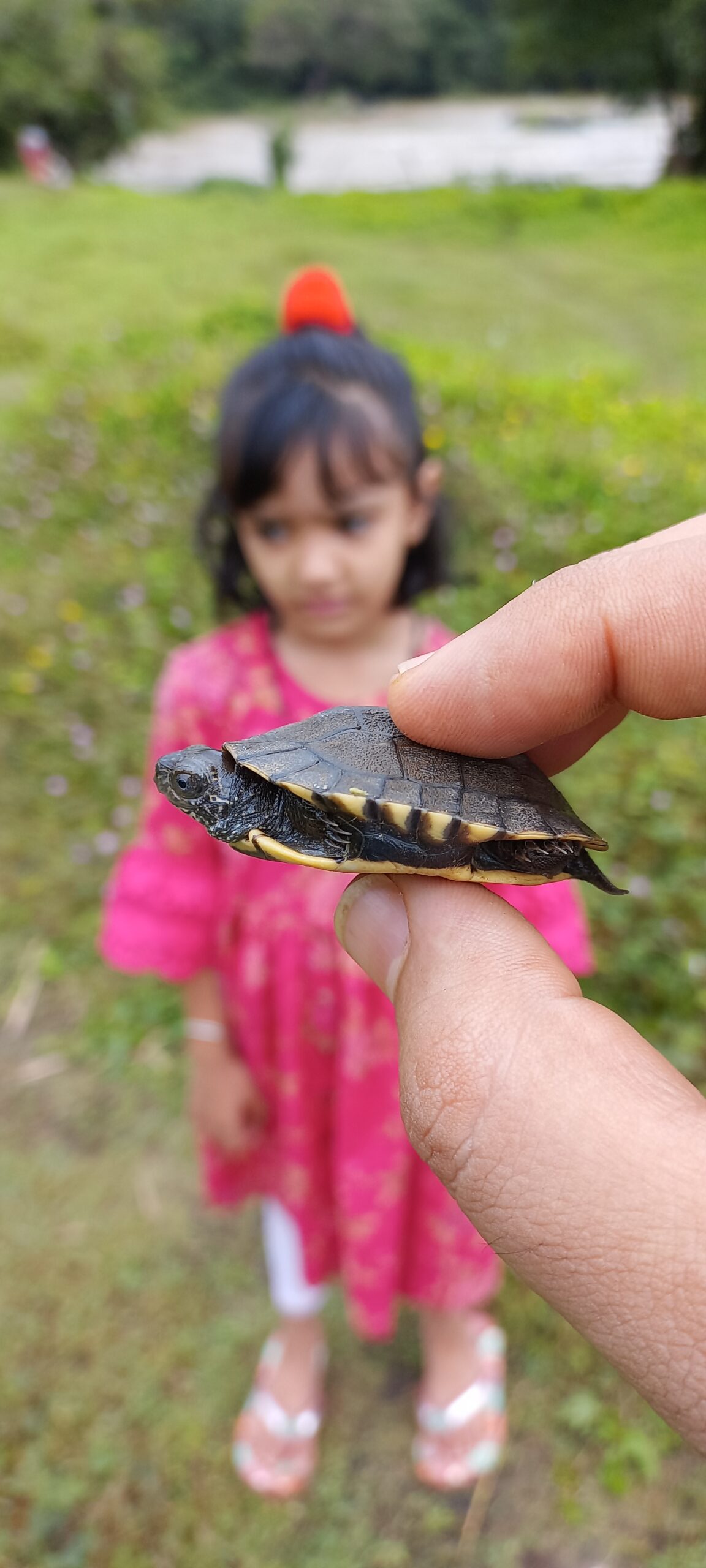 We could see and hear the Kabini River from our cottages. So, after resting for a while, we decided to take a stroll to the riverbank. Vritima continued her tryst with finding various bugs, insects and flowers. And this time too, her curious eyes spotted a unique reptile. It, (from my own interest and little knowledge), was maybe a baby Brown Roofed Turtle or Indian River Turtle. She spent quiet some time with the turtle, holding it for a while, observing it move around or watching it hide in it’s shell. It was such a beautiful creature. Vritima was so fascinated with it that, out of nowhere, she even named the baby turtle – RAINBOW..!! (Kids and their creative minds I must say).